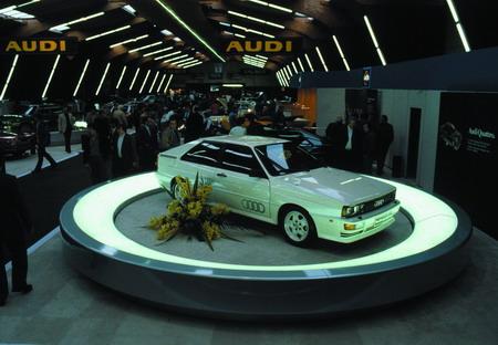 这款新型五座coupé车型结构紧凑,轴距仅2,524毫米,总长为4,404毫米。配备了Fuchs公司提供的6英寸铝合金轮毂。Ferdinand Pi?ch博士指出:“这辆汽车为汽车工程领域书写了新的篇章,它的出现意味着全时四轮驱动轿车的诞生。” 开创新纪元的奥迪quattro受到了世人的追捧:它那革命性的驱动系统理念以及卓越的动力特性立即赢得了业界的信服。它配备的五缸涡轮增压空气中冷发动机具有2,144毫升的排量,最大输出功率高达147千瓦(200马力),当发动机转速为3,500转/秒时达到最大扭矩285牛顿·米。奥迪quattro重量为1,290千克,在7.1秒内可以完成0至百公里时速的加速,最大速度超过220公里/小时。这款奥迪quattro以全时四轮驱动系统、坚固动感的悬架系统以及功能性的内饰设计风格向世人展示了奥迪堪称划时代的新车型。 当年,由于其卓越的性能,奥迪quattro立刻成为奥迪的拳头产品。尽管价格高达49,900德国马克,但是当1980年11月第一批汽车到达展厅以后,购车的客户仍然络绎不绝。在汽车产品周期前两年中,就有约2,000辆奥迪quattro驶离了英戈尔斯塔特的N 2个体装配厂。 1980年至1991年奥迪公司一直在生产奥迪quattro,总计达11,452辆。在最初的产品年中,内饰材料的运用方面变得愈发成熟。同时车辆也进行了部分技术改进,例如增加了数字显示系统与语音报警功能,刹车防抱死系统与自动巡迹功能等。1987年秋季,奥迪对这款车进行了一次技术升级,在奥迪quattro车上采用了托森中央差速器以及排量略大的五缸发动机。新的动力单元仍保持原来的147千瓦(200马力)的输出功率,但是实现了更大的低速扭矩。1989年,通过安装新的四阀发动机,这款车的输出功率增大至162千瓦(220马力),同时最大时速提升至230公里/小时。 1984年quattro®系列中添加了一个特别的车型:Sport quattro—轴距缩短至2,204毫米,配备了最新研发的铝制汽缸四气阀涡轮增压发动机,输出功率达225千瓦(306马力)。虽然名义上仍属于民用车,但是由于大量采用Kevlar纤维以及其他降低重量的材料,该款车型也成为汽车拉力运动中有力的竞争者。这款车的售价同样不菲,高达203,850德国马克。 拉力赛场上的quattro® 在1981年Group B赛季期间,奥迪quattro首次参赛便展示了其无可比拟的优势。芬兰选手Hannu Mikkola驾驶奥迪quattro先后赢得了两场比赛,在车手排行榜中位居第三。在Sam Remo的比赛中,奥迪的法国女车手Michele Mouton一跃成为全球拉力锦标赛史上第一位夺冠的女性。