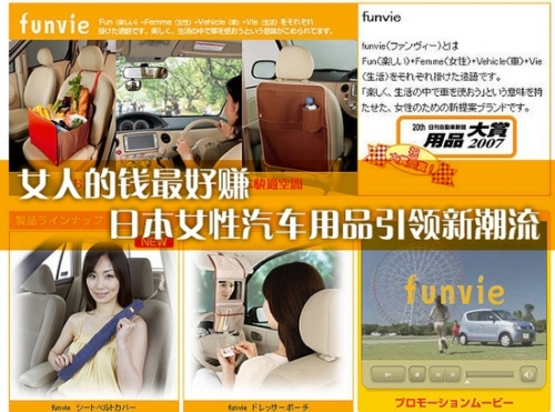 男人说,女人的钱最好赚。因为,女人掌管家中财政大权。犹太人说,女人的钱最好赚。因为,女人花钱太感性。众商家说,女人的钱最好赚。因为,女人身上有挖不完的资源。对此,众多日本的汽车配件商也是非常认同,纷纷推出了形式各异的女性车主专用的车内物品。