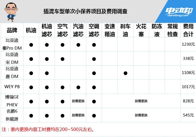 插混车型由于驱动系统中有发动机的存在,所以在常规保养时与燃油车并无区别,每次保养时均需要对机油、机滤进行更换。单次小保养的费用平均保持在1 000 ~ 1 500元左右,而像更换全车油液及火花塞的情况下费用在3 000元左右。不过这种大保养基本在50 000 km时才会进行,而这5 万公里省下来的油钱,已经远远可以抵消大保养所产生的费用了。