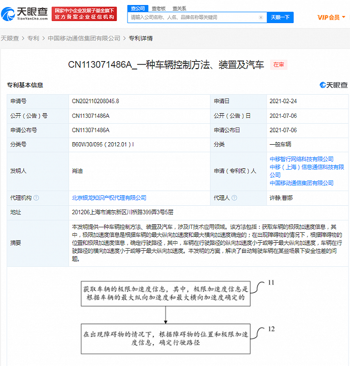 据天眼查APP显示,近日,中国移动通信集团有限公司等公开“一种车辆控制方法、装置及汽车”专利,公告号CN113071486A,申请日期为2021年2月。专利摘要显示,发明涉及IT技术应用领域。方法包括:获取车辆的极限加速度信息;在出现障碍物的情况下,根据障碍物的位置和极限加速度信息,确定行驶路径,解决了自动驾驶车辆在某些场景下安全性差的问题。