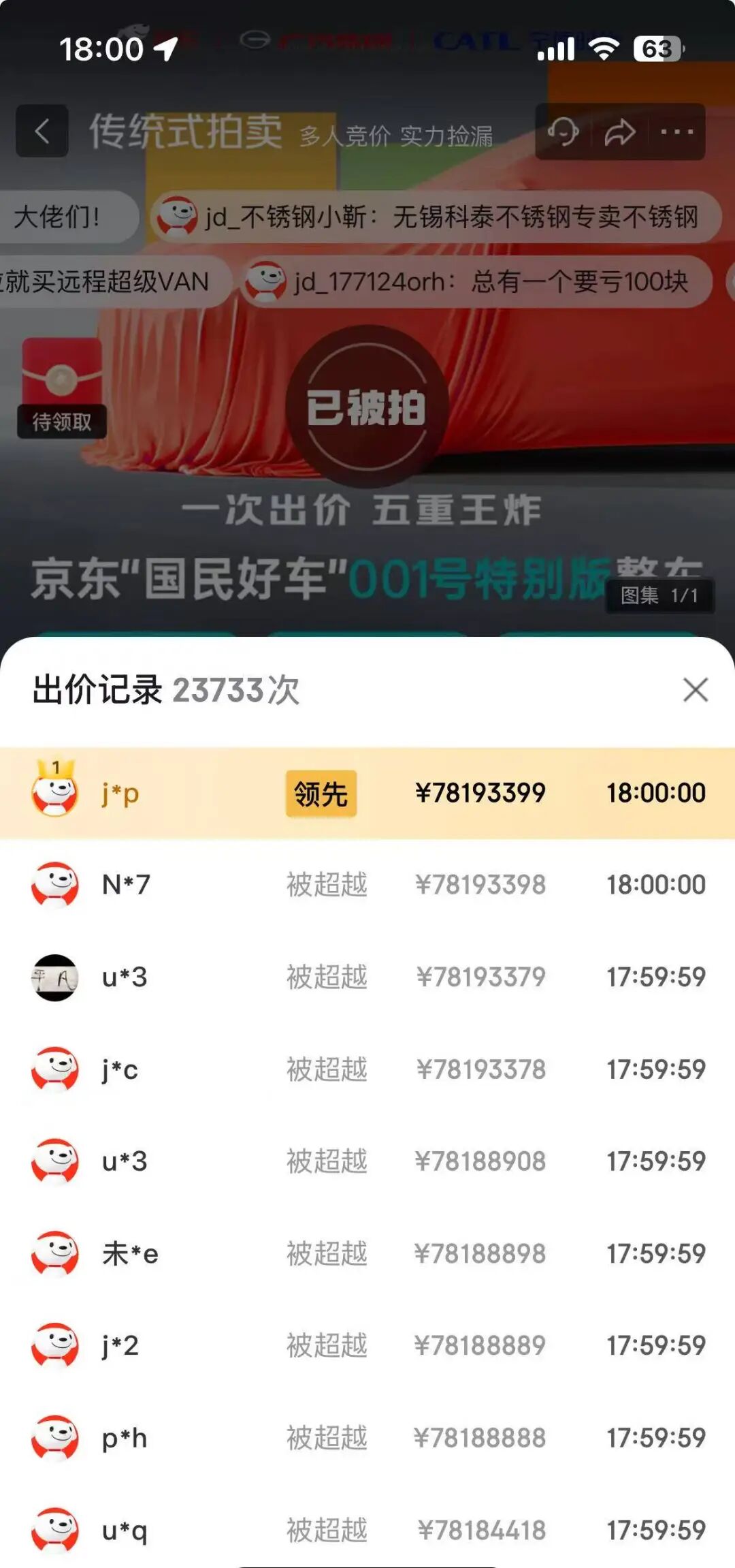 10月22日14时,京东001号“国民好车”在京东拍卖平台正式开拍,至18时结束时,最终价格为7819.3399万元,京东用户@j*p竞拍成功,出价记录共23733次。拍卖页面显示,开拍几秒后,价格就达到了10万元,接下来1分钟超80万元,至16分钟已超过1000万元。