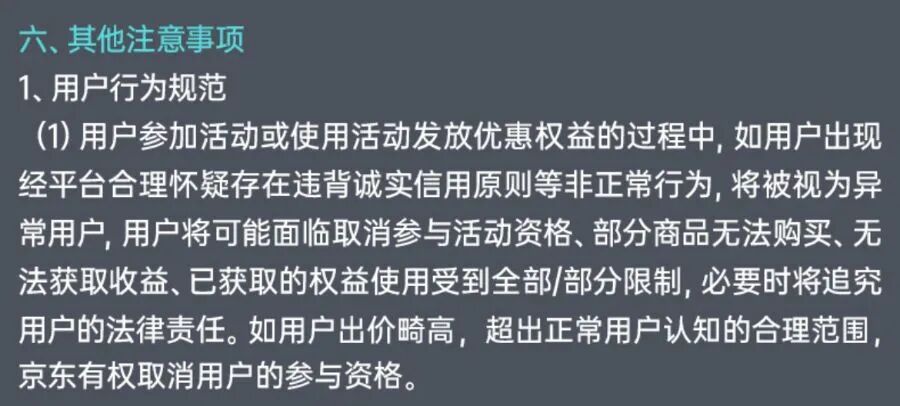 竞价成功的用户会收到短信支付提醒,一小时内仍未提交订单的用户将收到电话支付提醒。用户需要在竞价成功后24小时内提交订单,并在30分钟内支付货款,若逾期未提单或逾期未支付,订单将被取消。若用户出价畸高,“超出正常用户认知的合理范围”,京东有权取消用户的参与资格。