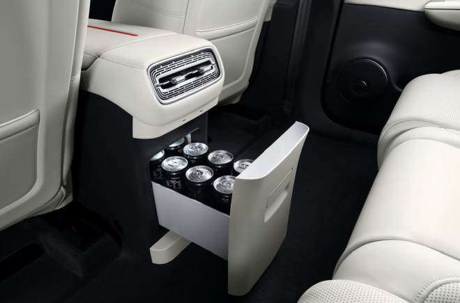 舒适性配置方面,副驾座椅配备慢回弹发泡坐垫与电动腿托;后排座椅可电动调节靠背角度。门板上直接集成座椅加热、通风按键。中间有着-6℃~50℃可调的冷暖冰箱,能轻松容纳6瓶500ml饮品。