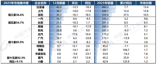 数据显示,2025年销量超过百万辆的车企集团共10家,分别为比亚迪、上汽、吉利、一汽、长安、奇瑞、东风、北汽、广汽和长城汽车,合计销量为2887.4万辆,占比汽车总销量的83.9%。不过陈士华也提醒,“目前我国车企集团尚没有一家年销量超过500万辆,距离国际巨头还有很大差距。”